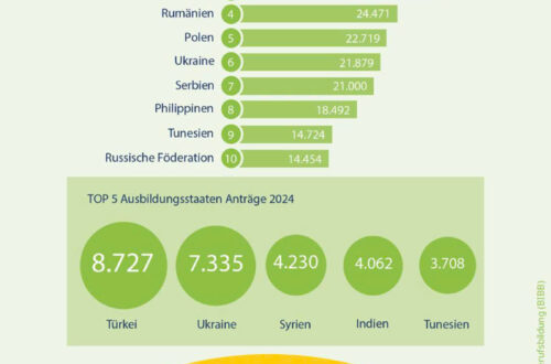 Thống kê mới nhất từ BIBB (Viện Giáo dục Nghề Đức) cho thấy: Top 10 quốc gia có nhiều hồ sơ công nhận nghề (Anerkennung) tại Đức giai đoạn 2012-2024 thuộc về Syria, Bosnia & Herzegowina, Thổ Nhĩ Kỳ, Romania, Ba Lan, Ukraine, Serbia, Philippines, Tunisia và Nga. Riêng năm 2024, Top 5 quốc gia nộp đơn nhiều nhất là: Thổ Nhĩ Kỳ – 8.727 Ukraine – 7.335 Syria – 4.230 Ấn Độ – 4.062 Tunisia – 3.708 Ngoài những quốc gia đã có quan hệ hợp tác lâu dài cùng Đức như Thổ Nhĩ Kỳ, các nước Balkan, và các quốc gia có lượng người tị nạn nhập cư…
