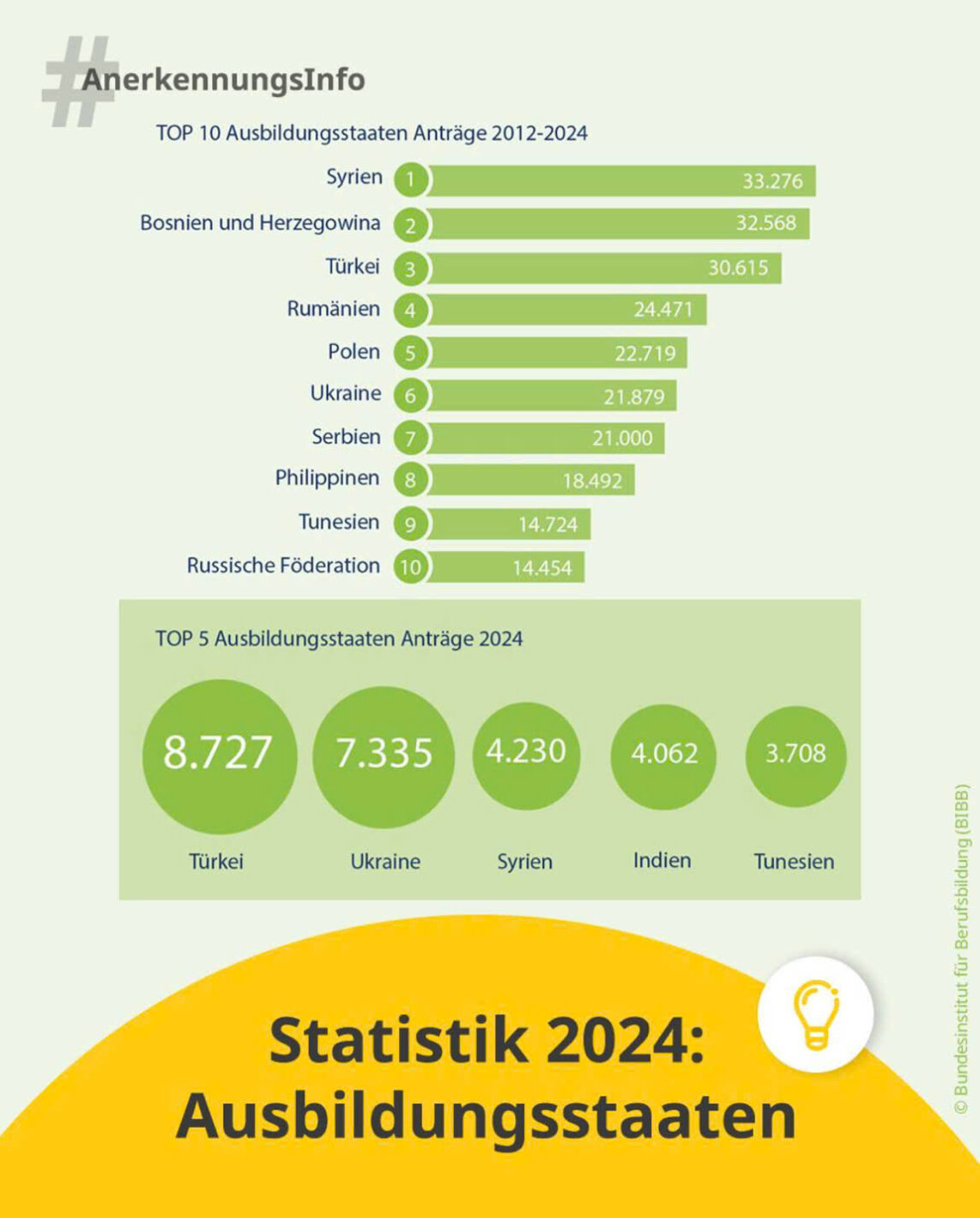 Thống kê mới nhất từ BIBB (Viện Giáo dục Nghề Đức) cho thấy: Top 10 quốc gia có nhiều hồ sơ công nhận nghề (Anerkennung) tại Đức giai đoạn 2012-2024 thuộc về Syria, Bosnia & Herzegowina, Thổ Nhĩ Kỳ, Romania, Ba Lan, Ukraine, Serbia, Philippines, Tunisia và Nga. Riêng năm 2024, Top 5 quốc gia nộp đơn nhiều nhất là: Thổ Nhĩ Kỳ – 8.727 Ukraine – 7.335 Syria – 4.230 Ấn Độ – 4.062 Tunisia – 3.708 Ngoài những quốc gia đã có quan hệ hợp tác lâu dài cùng Đức như Thổ Nhĩ Kỳ, các nước Balkan, và các quốc gia có lượng người tị nạn nhập cư…
